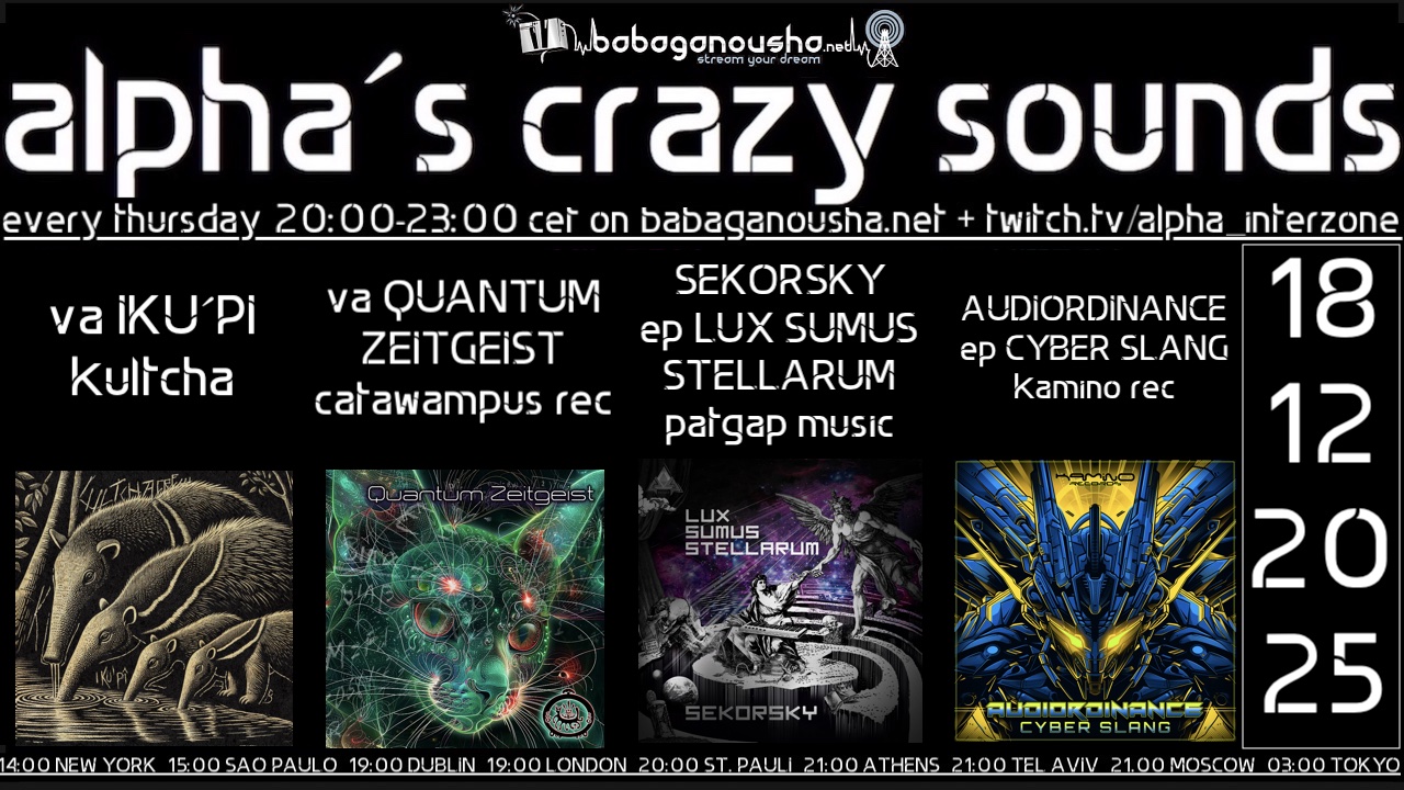 DECEMBER 04, 11, =18=, 25 2025: SHOWS OF ALPHA.S CRAZY SOUNDS EVERY THURSDAY ON babaganousha.net + twitch.tv/alpha_interzone!